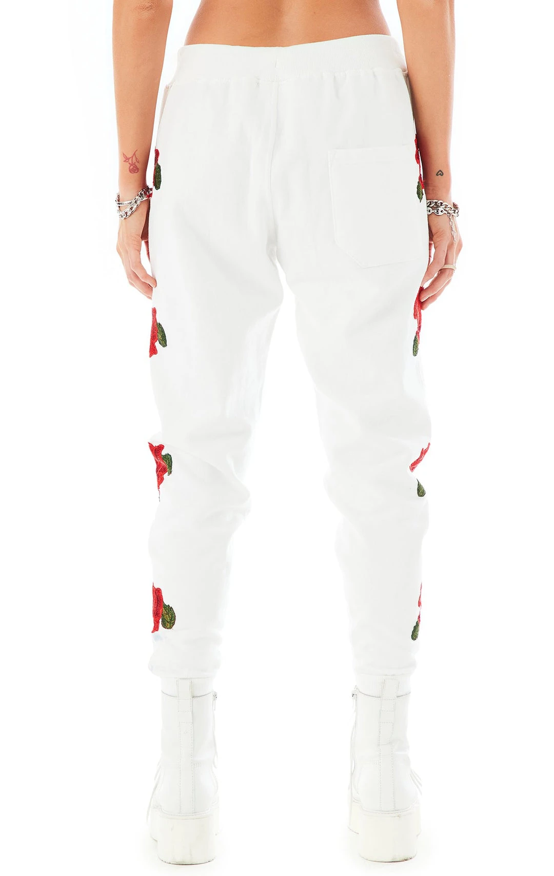 They say you can never have enough sweatpants. With a soft relaxed fit, you’ll be living in these white rose embroidered sweatpants. Style these with our corset tank and matching rose embroidered zip up to make this your go-to set. Quarantined never looked so good on.