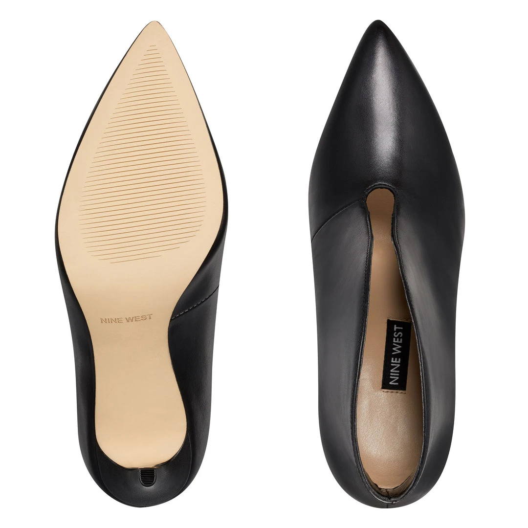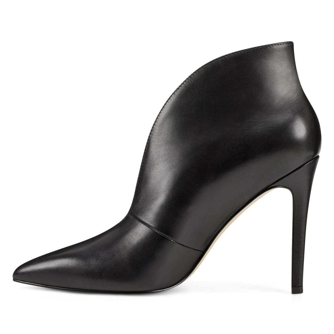 A plunging topline dramatizes out Tetty contemporary pointy-toe bootie counterbalanced by a sleek stiletto heel.