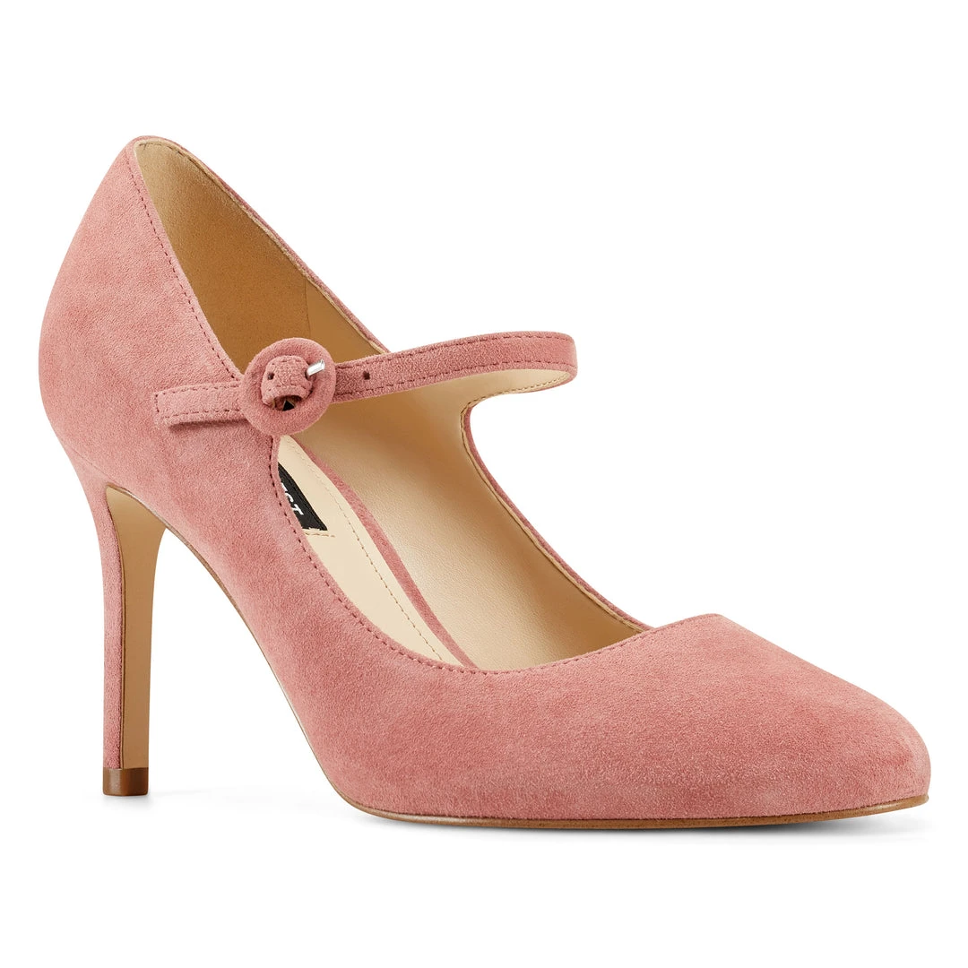 A svelte mary-jane strap bridges the vamp of a sophisticated suede pump lifted on a classic 3.43 heel.