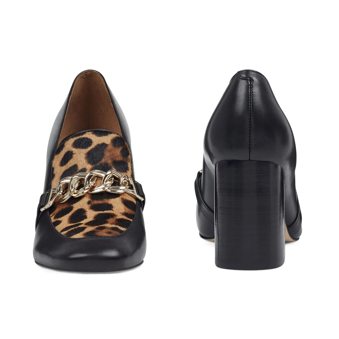 A decorative chain across the vamp leads up from a stylish round toe counterbalanced by a 3.99″ block heel.