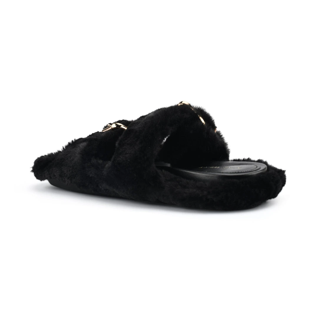 You will want to wear the trendy Plush two strap slide sandal all year long with its faux fur exterior and metallic buckles. Pair them with socks in the cooler months for the street style vibe. The molded footbed makes this sandal extra comfy.