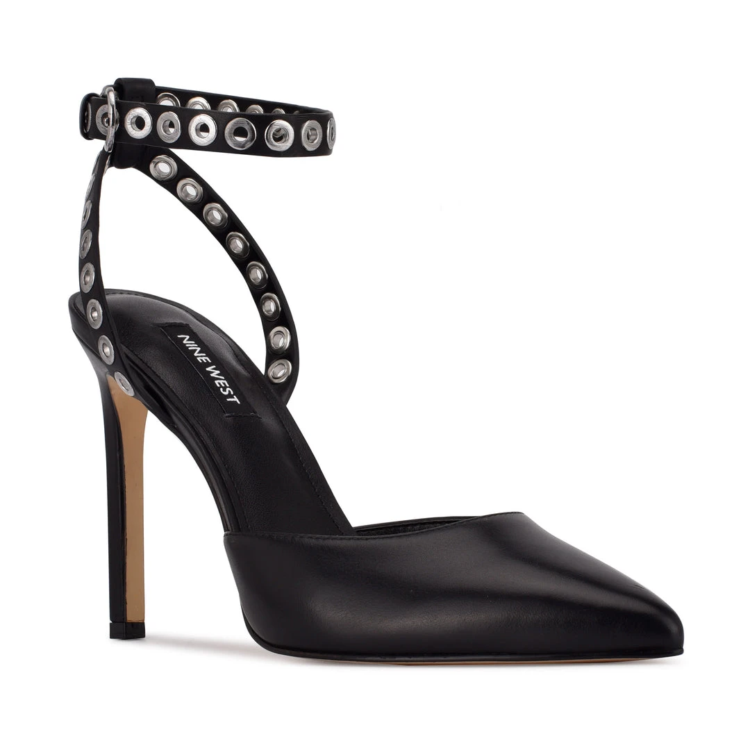 Add a touch of rock and roll glam to your favorite pointed toe pump with the Nine West Timia. This sky high stiletto pump features a sexy ankle strap adorned with metallic grommets. Perfect for the office or a night out.